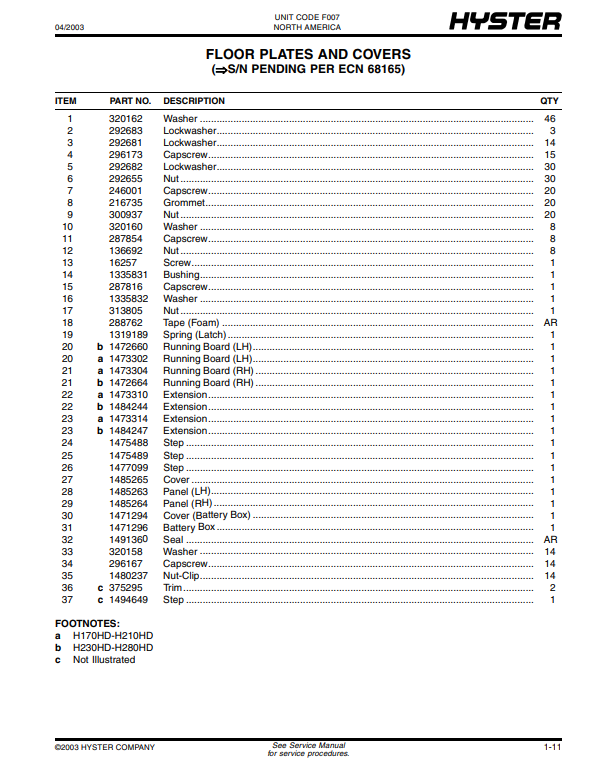 Manual de Partes Montacarga Hyster H170HD, H190HD, H210HD, H230HD, H250HD, H280HD (F007)