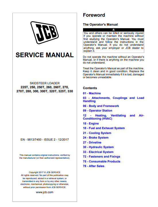 Manual de Reparación Minicargador JCB 225T, 250, 250T, 260, 260T, 270, 270T, 280, 300, 300T, 320T, 325T, 330